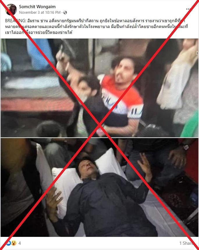 คำบรรยายโพสต์เขียนว่า: “BREAKING: อิมราน ข่าน อดีตนายกรัฐมนตรีปากีสถาน ถูกยิงในข้อหาลอบสังหาร รายงานว่าเขาถูกตีที่ขาหลายครั้งแต่รอดตายและตอนนี้กำลังรักษาตัวในโรงพยาบาล มือปืนกำลังปล้ำโดยชายอีกคนหนึ่งในขณะที่เขาไล่ออก ซึ่งอาจช่วยชีวิตของข่านได้”