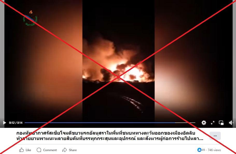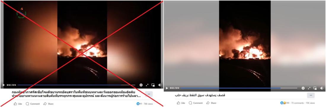 หลังจากกองกำลังรัสเซียและซีเรียระดมยิงโจมตีพื้นที่ฐานที่มั่นเพื่อยับยั้งการเข้ายึดครองเมืองหลวงของฝ่ายกบฏซีเรีย วิดีโอเหตุระเบิดและเพลิงไหม้ฉบับหนึ่งถูกนำมาแชร์บนสื่อสังคมออนไลน์พร้อมคำกล่าวอ้างเท็จว่าเป็นวิดีโอรถบรรทุกกระสุนในเมืองอิดลิบระเบิดจากเหตุโจมตีเมื่อวันที่ 1 ธันวาคม 2567 แต่ที่จริงแล้ว วิดีโอนี้มาจากเหตุยิงขีปนาวุธใส่โรงงานกลั่นน้ำมันชั่วคราวในเมืองอเลปโปเมื่อปี 2564