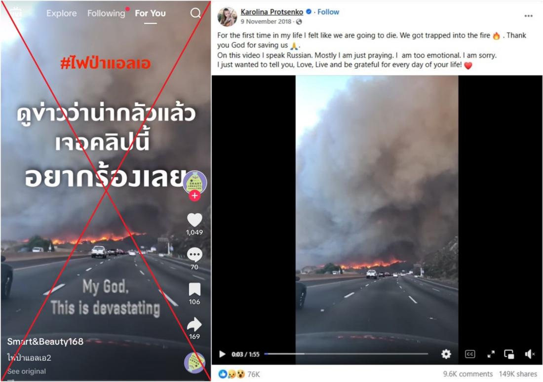 คลิปจากกล้องหน้ารถแสดงเหตุไฟป่าในปี 2561 ไม่ใช่ไฟป่าลอสแองเจลิสปี 2568