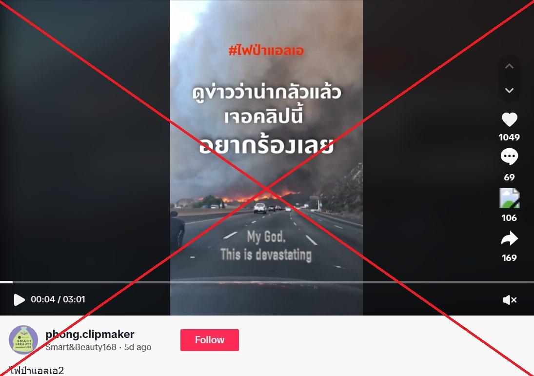 โพสต์ติ๊กตอกเมื่อวันที่ 6 มกราคม 2568 แชร์คลิปวิดีโอที่ฝังข้อความภาษาไทยว่า "#ไฟป่าแอลเอ ดูข่าวว่าน่ากลัวแล้ว เจอคลิปนี้อยากร้องเลย"