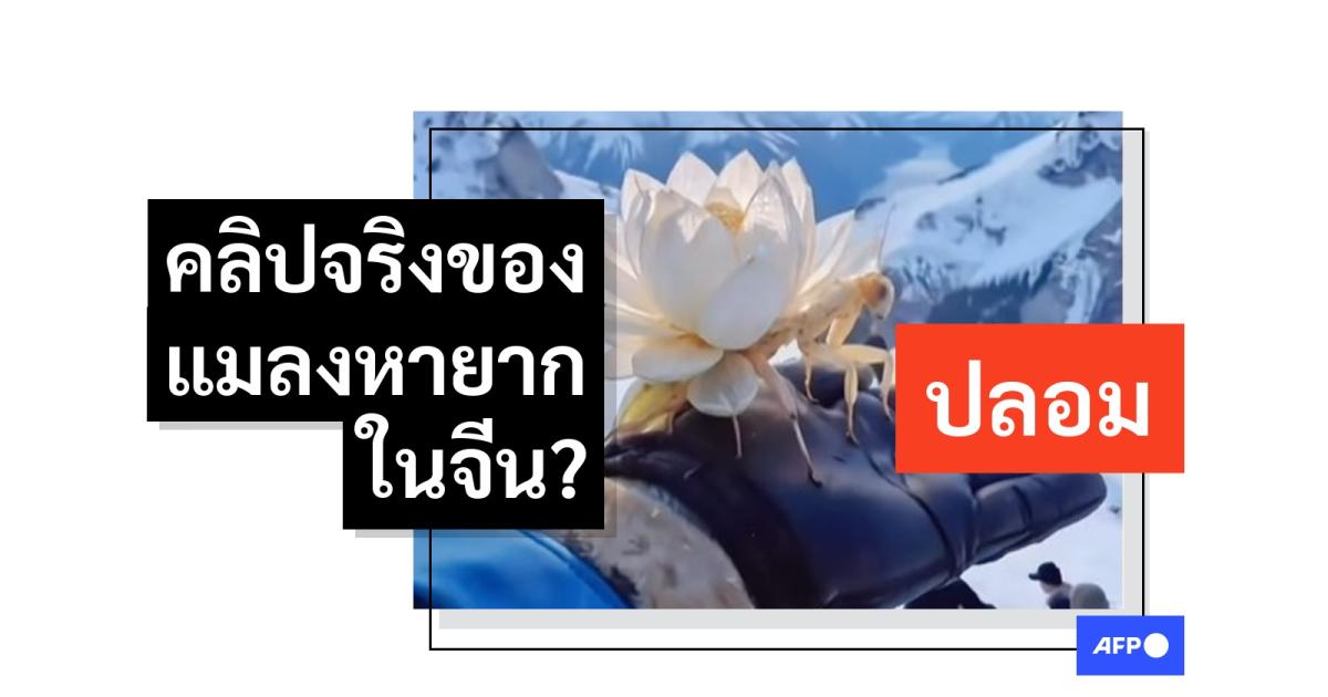 วิดีโอรีลแสดงภาพสิ่งมีชีวิตลักษณะคล้ายตั๊กแตนที่มีดอกบัวสีขาวอยู่บนหลังขณะกำลังบินมาเกาะมือของชายคนหนึ่งถูกแชร์บนเฟซบุ๊กเมื่อวันที่ 10 มีนาคม 2568