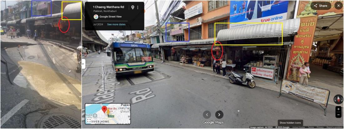 ภาพจากคลิปดังกล่าวตรงกับภาพถ่ายระดับถนนที่ปรากฏในแผนที่กูเกิลบริเวณถนนแจ้งวัฒนะในปากเกร็ด (ลิงก์บันทึก)
