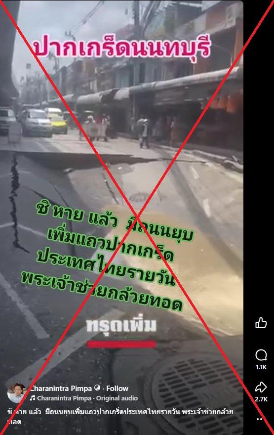 หลังเกิดเหตุหลุมยุบที่ถนนสามเสนในเดือนกันยายน 2568 ผู้ใช้สื่อสังคมออนไลน์ได้แชร์คลิปวิดีโอฉบับหนึ่ง พร้อมคำกล่าวอ้างเท็จว่าเป็นภาพเหตุถนนทรุดใหม่ที่เพิ่งเกิดขึ้น แต่คลิปดังกล่าวเป็นภาพเก่าที่ถูกเผยแพร่ตั้งแต่ปี 2567