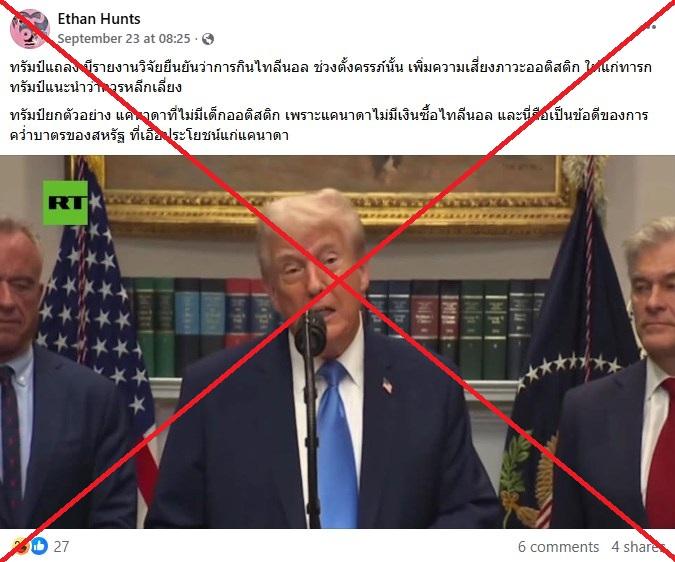 "อะเซตามิโนเฟน หรือที่รู้จักกันทั่วไปในชื่อยาไทลินอล หากใช้ขณะตั้งครรภ์อาจเพิ่มความเสี่ยงทำให้เด็กเป็นโรคออทิสติกสูงขึ้นอย่างมาก" ทรัมป์กล่าวในงานแถลงข่าวเมื่อวันที่ 22 กันยายน 2568