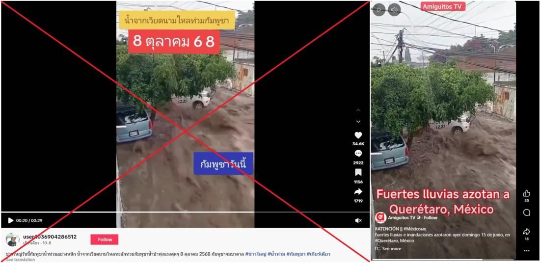 หลังพายุพัดถล่มประเทศเวียดนามและกัมพูชาจนเกิดน้ำท่วมใหญ่ในช่วงต้นเดือนตุลาคม 2568 ผู้ใช้สื่อสังคมออนไลน์ได้แชร์คลิปวิดีโอรถยนต์ถูกกระแสน้ำเชี่ยวพัดไปบนถนน และอ้างว่าเป็นคลิปจากเหตุน้ำท่วมในประเทศกัมพูชา แต่ที่จริงแล้ว นี่เป็นคลิปเก่าที่ถูกเผยแพร่ตั้งแต่เดือนมิถุนายน ปี 2568 และถูกบันทึกไว้ได้ในประเทศเม็กซิโก