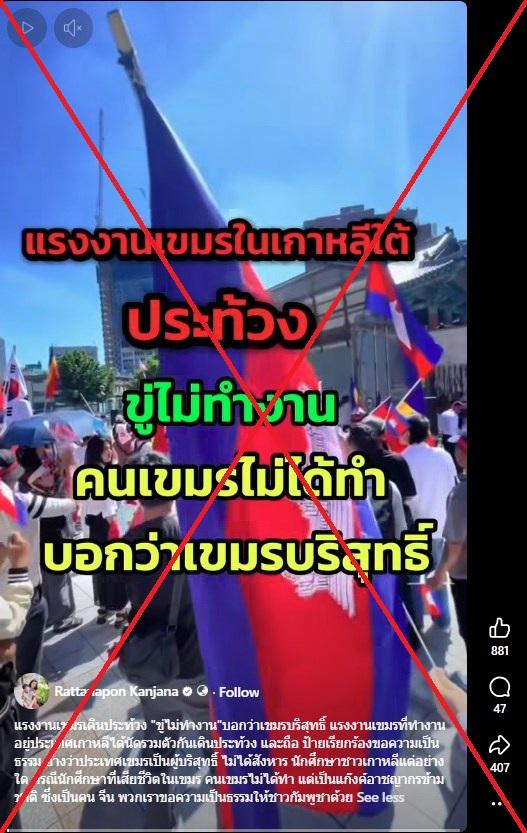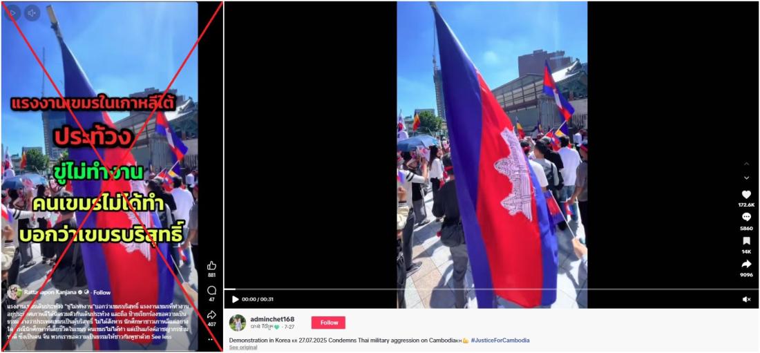 ประเด็นร้อนจากกรณีนักศึกษาเกาหลีใต้ที่ถูกทรมานจนเสียชีวิตในประเทศกัมพูชา ทำให้ผู้ใช้สื่อสังคมออนไลน์ในไทยนำคลิปวิดีโอเก่ามาเผยแพร่พร้อมคำกล่าวอ้างเท็จว่า คลิปดังกล่าวเป็นคลิปการเคลื่อนไหวของแรงงานกัมพูชาในเกาหลีใต้เพื่อปฏิเสธความรับผิดชอบต่อการเสียชีวิตของนักศึกษาชาวต่างชาติในศูนย์สแกมเมอร์ อย่างไรก็ตาม ที่จริงแล้ว คลิปดังกล่าวแสดงภาพการประท้วงของชาวกัมพูชาในกรุงโซลในช่วงปลายเดือนกรกฏาคม 2568