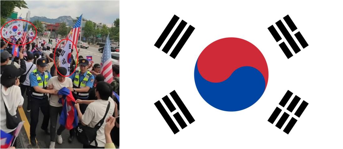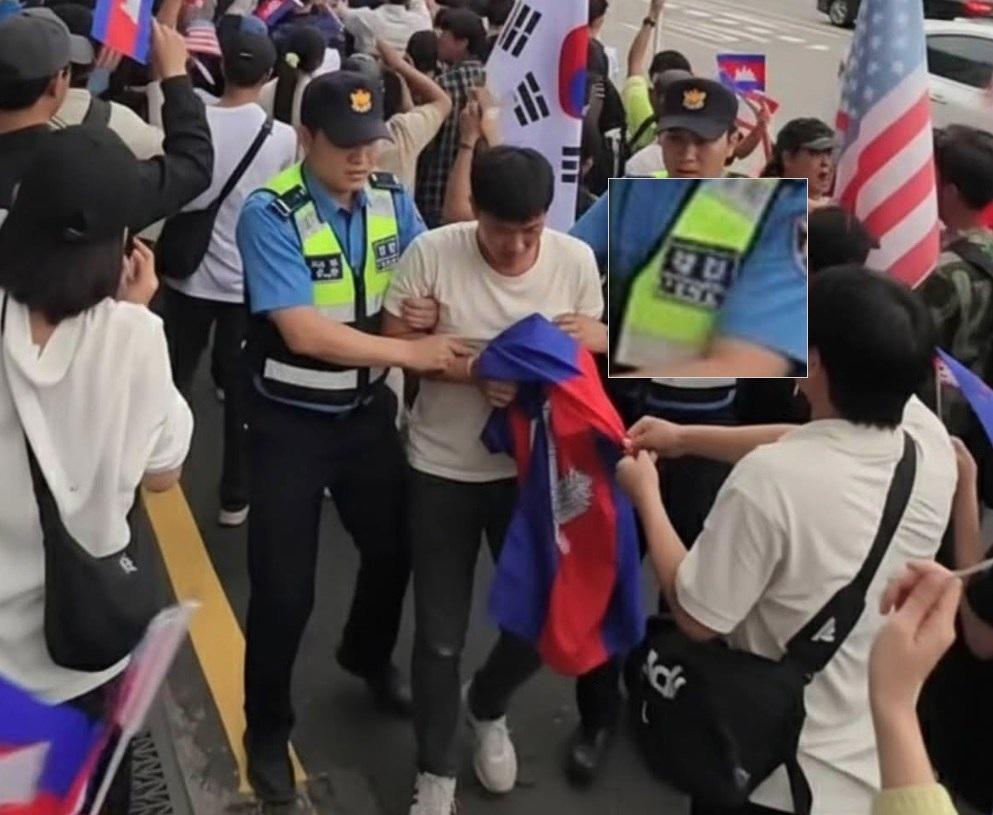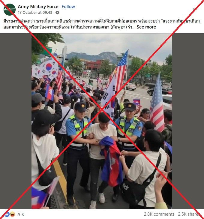 "ชาวเน็ตเกาหลีแชร์ภาพตำรวจเกาหลีใต้จับกุมผีน้อยเขมร พร้อมระบุว่า 'แรงงานกัมพูชาเถื่อนออกมาประท้วงเรียกร้องความยุติธรรมให้กับประเทศของเขา (กัมพูชา) ร่วมกับผู้ชุมนุมประมาณ 12 คน ถูกตำรวจจับในเช้าวันนี้" โพสต์เฟซบุ๊กเมื่อวันที่ 17 ตุลาคม 2568 เขียนคำบรรยาย