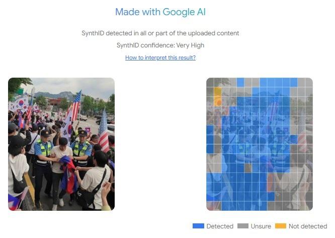 ภาพดังกล่าวยังเผยให้เห็นลักษณะที่ผิดปกติ เช่น แถบสีดำในธงชาติเกาหลีใต้ที่เพิ่มขึ้นมา และตัวอักษรที่ไม่สามารถอ่านได้บนเครื่องแบบของเจ้าหน้าที่ตำรวจ ซึ่งความผิดปกติในภาพเหล่านี้เป็นข้อบ่งชี้ของการสร้างหรือดัดแปลงภาพด้วยเอไอ (ลิงก์บันทึก)