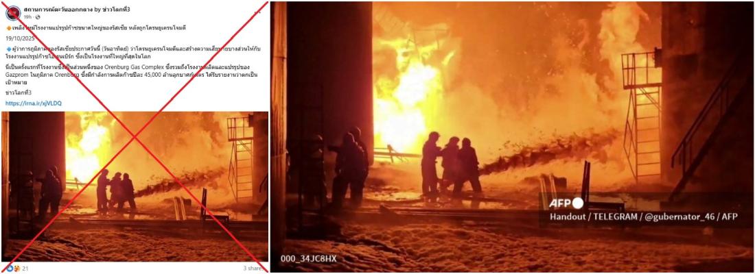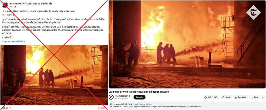 ยูเครนยกระดับการโจมตีโรงกลั่นน้ำมันและระบบพลังงานในรัสเซีย โดยมีโรงงานแปรรูปก๊าซขนาดใหญ่โอเรนเบิร์กทางตอนใต้ของรัสเซียที่ตกเป็นเป้าหมายการโจมตีในวันที่ 19 ตุลาคม 2568 อย่างไรก็ตาม ภาพเหตุเพลิงไหม้ที่ถูกแชร์บนโลกออนไลน์ที่จริงแล้วเป็นเหตุการณ์ที่เกิดขึ้นในภูมิภาคเคิร์สก์ตั้งแต่ปี 2567