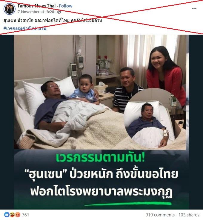 โพสต์ดังกล่าวแชร์ภาพฮุน เซนนอนอยู่บนเตียงในโรงพยาบาลแห่งหนึ่ง โดยมีสมาชิกในครอบครัวอยู่รายล้อม รวมถึงนายกรัฐมนตรีฮุน มาเนต ลูกชายของฮุน เซนด้วย