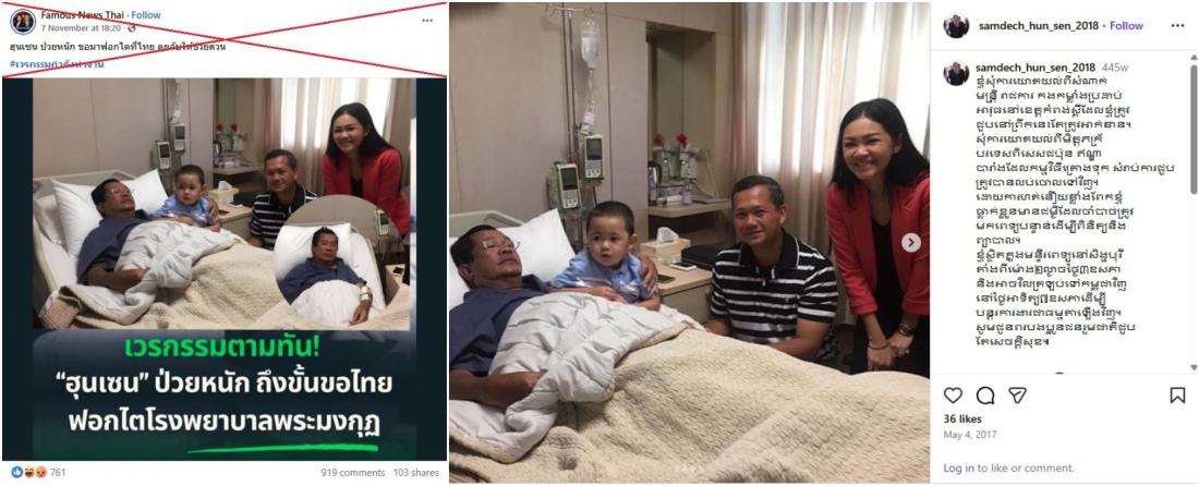 แต่ภาพของฮุน เซนขณะรักษาตัวอยู่ในโรงพยาบาลนั้นไม่เกี่ยวข้องกับความขัดแย้งระหว่างไทยกับกัมพูชา ที่จริงแล้ว ภาพดังกล่าวถูกแชร์บนโพสต์อินสตาแกรมของฮุน เซนตั้งแต่ปี 2560