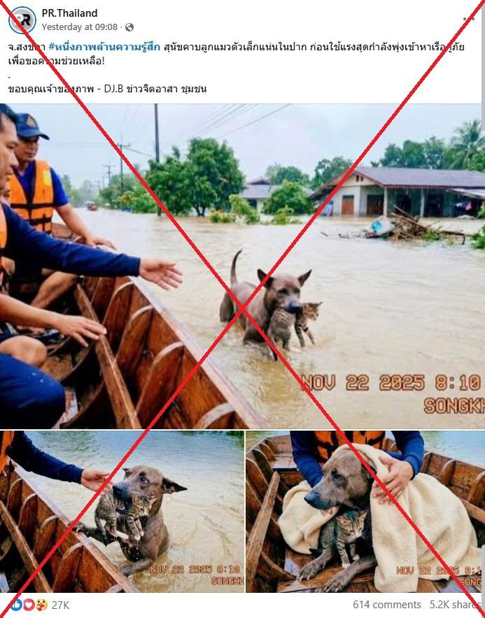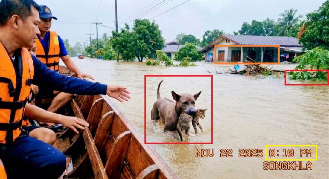 หลายจังหวัดในภาคใต้ของไทยต้องเผชิญกับอุทกภัยครั้งใหญ่หลังฝนตกหนักอย่างต่อเนื่องในเดือนพฤศจิกายน แต่ภาพสุนัขคาบลูกแมวฝ่าน้ำท่วมไปหาเจ้าหน้าที่กู้ภัยบนเรือซึ่งถูกแชร์มากกว่าหมื่นครั้ง ที่จริงแล้วเป็นภาพที่ถูกสร้างขึ้นด้วยปัญญาประดิษฐ์ ผู้ใช้งานที่เผยแพร่ภาพชุดนี้ในโพสต์แรกระบุว่านี่ไม่ใช่ภาพเหตุการณ์จริง ขณะที่เครื่้องมือตรวจสอบของกูเกิลพบว่าภาพเหล่านี้ถูกสร้างขึ้นด้วยเอไอ