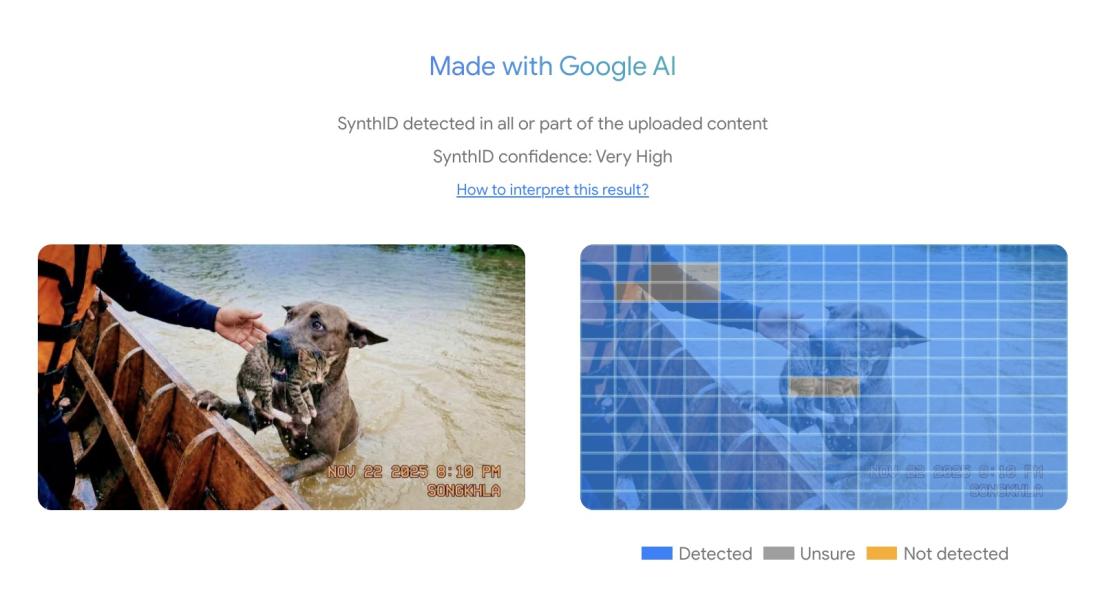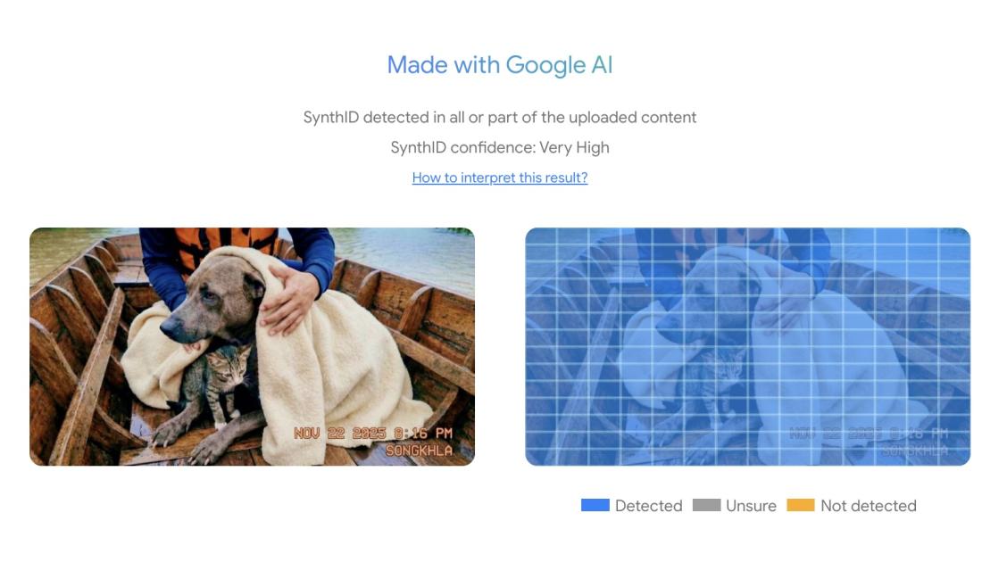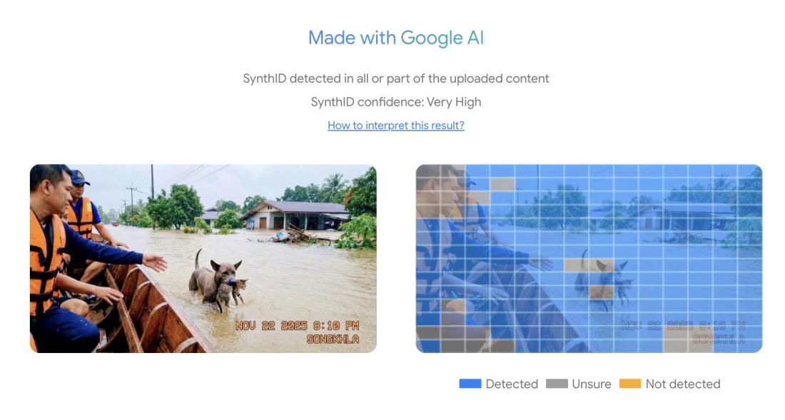 ซินธ์ไอดี (SynthID Detector) ซึ่งเป็นเครื่องมือตรวจสอบเนื้อหาเอไอที่เปิดตัวในเดือนพฤษภาคม 2568 พบลายน้ำดิจิทัลที่ยืนยันว่าภาพดังกล่าวถูกสร้างขึ้นด้วยโมเดลเอไอของกูเกิล (ลิงก์บันทึก)