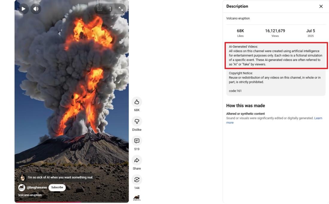 ช่องยูทูบดังกล่าวมีผู้ติดตามมากกว่า 200,000 ราย และมักเผยแพร่วิดีโอที่สร้างจากเอไอ โดยแสดงภาพภัยพิบัติต่าง ๆ อย่างการปะทุของภูเขาไฟและพายุเฮอริเคน