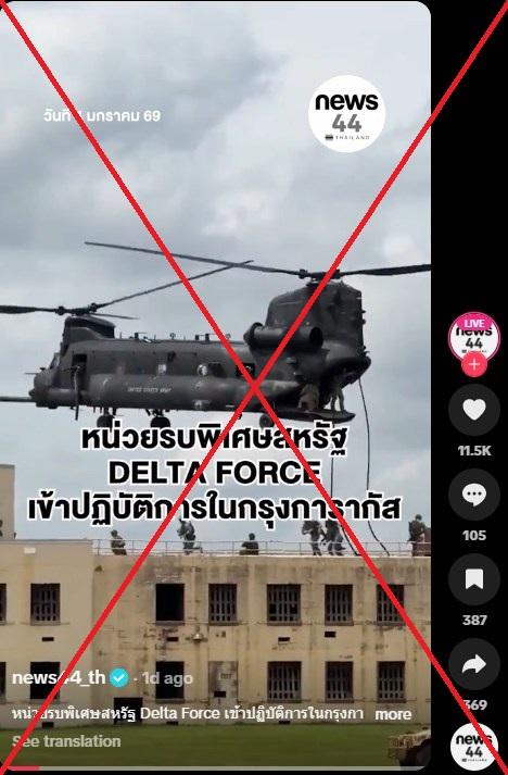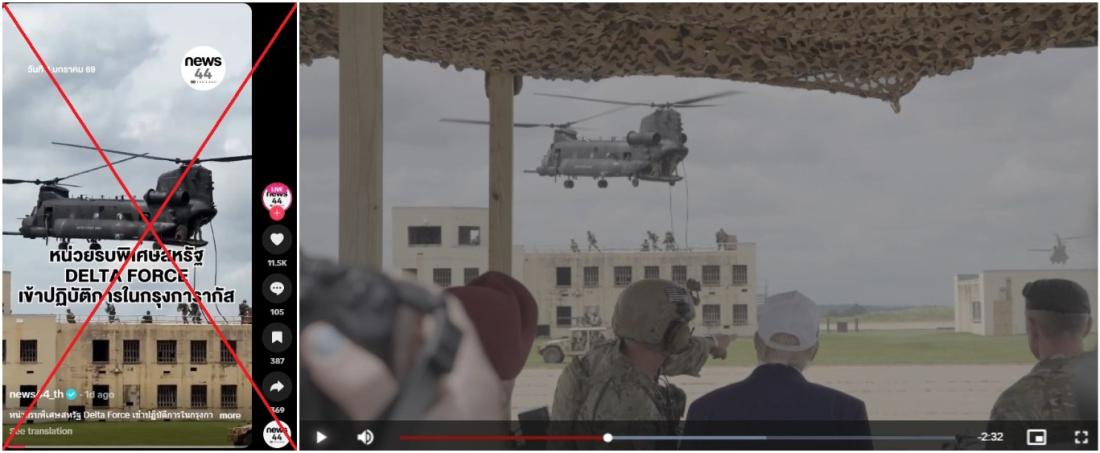 "หน่วยรบพิเศษสหรัฐ DELTA FORCE เข้าปฏิบัติการในกรุงการากัส" ข้อความบนวิดีโอติ๊กตอกระบุโดยอ้างถึงหน่วยต่อต้านการก่อการร้ายระดับสูงของกองทัพสหรัฐฯ ที่เป็นผู้จับกุมมาดูโร (ลิงก์บันทึก)