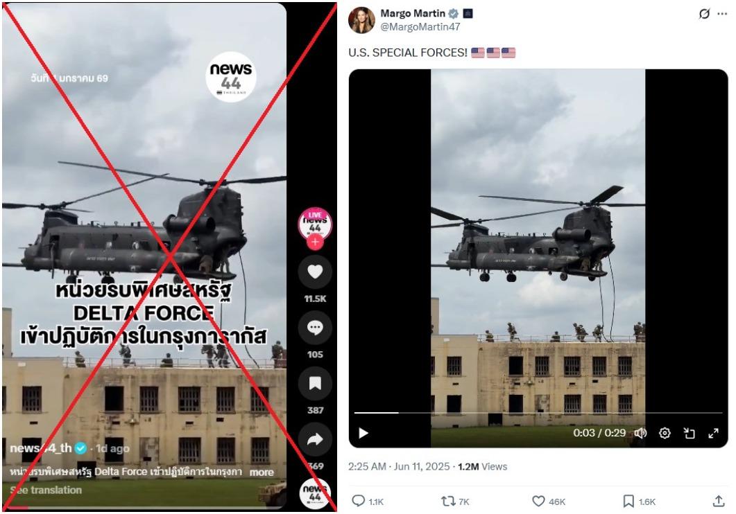 หลังกองกำลังสหรัฐฯ จับกุมอดีตประธานาธิบดีนิโกลัส มาดูโร แห่งเวเนซูเอลาในวันที่ 3 มกราคม 2569 คลิปเก่าจากปี 2568 ถูกนำมาแชร์ในโพสต์เท็จโดยอ้างว่าเป็นคลิปปฏิบัติการในกรุงการัสกัส แต่ที่จริงแล้ว นี่คือการฝึกซ้อมทางทหารในรัฐนอร์ธแคโรไลนาซึ่งมีประธานาธิบดีสหรัฐฯ โดนัลด์ ทรัมป์ เข้าร่วมรับชมด้วย