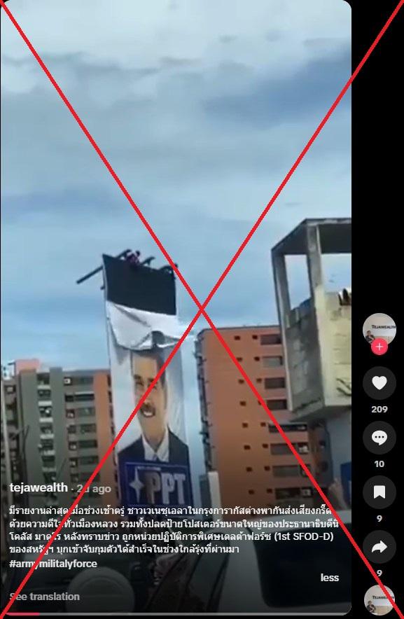 วิดีโอชาวเวเนซุเอลาฉีกป้ายภาพขนาดใหญ่ของนิโกลัส มาดูโร แพร่กระจายในโพสต์ที่อ้างว่าเป็นภาพการเฉลิมฉลองหลังจากผู้นำเวเนซุเอลาถูกหน่วยรบพิเศษของสหรัฐฯ ควบคุมตัวในวันที่ 3 มกราคม 2569 แต่ที่จริงแล้ว คลิปดังกล่าวมาจากเหตุชุมนุมปี 2567 หลังมาดูโรชนะการเลือกตั้งท่ามกลางเสียงวิจารณ์เกี่ยวกับความโปร่งใส