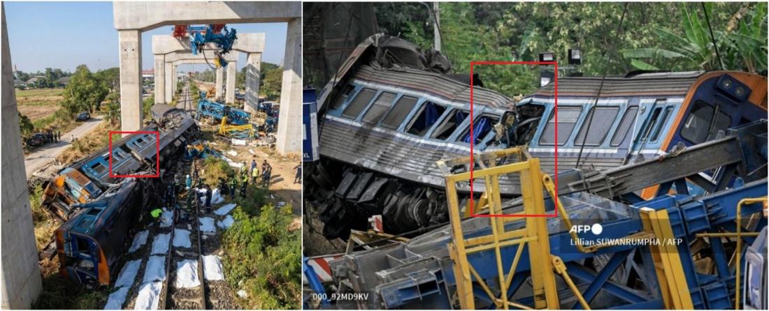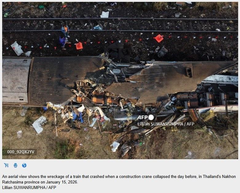 ภาพนี้ปรากฏในโลกออนไลน์หลังเครนก่อสร้างโครงการรถไฟความเร็วสูงพังถล่มลงมาใส่รถไฟที่กำลังแล่นผ่านอ.สีคิ้ว จ.นครราชสีมาเมื่อวันที่ 14 มกราคม 2569 จนทำให้มีผู้เสียชีวิตแล้วอย่างน้อย 32 คน และบาดเจ็บ 66 คน (ลิงก์บันทึก)