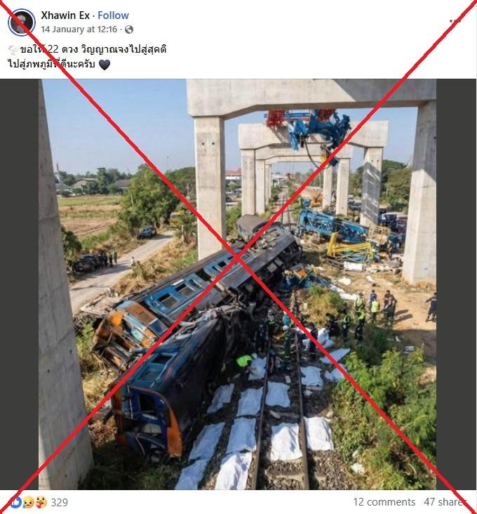 โพสต์ดังกล่าวแชร์ภาพที่แสดงให้เห็นขบวนรถไฟตกรางและร่องรอยความเสียหายรุนแรง ขณะที่ร่างผู้เสียชีวิตถูกคลุมด้วยผ้าขาวอยู่บนรางรถไฟ