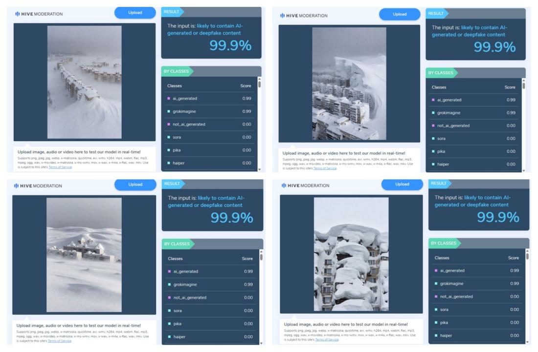 หิมะในคลิปดูเรียบเนียนและสมมาตรเกินจริง และยังแยกตัวในแนวตั้งอย่างผิดปกติ ด้านรายละเอียดทางสถาปัตยกรรมบริเวณหน้าต่างและระเบียงพบส่วนที่บิดเบี้ยวซึ่งเป็นลักษณะที่มักปรากฏในเนื้อหาที่สร้างจากเอไอ