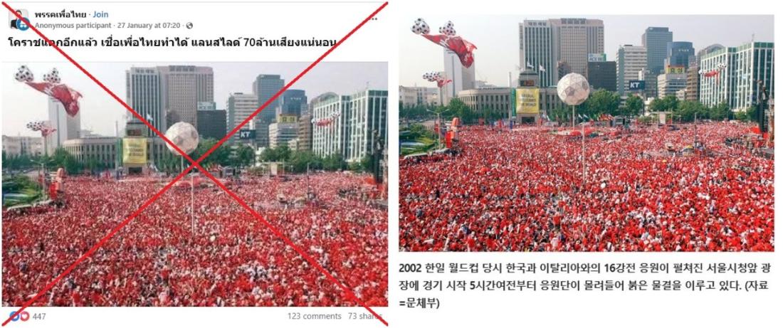 ในช่วงที่บรรยากาศการหาเสียงเลือกตั้งในประเทศไทยเริ่มคึกคักก่อนการเลือกตั้งทั่วไปในวันที่ 8 กุมภาพันธ์ ผู้ใช้สื่อสังคมออนไลน์จำนวนหนึ่งได้แชร์ภาพฝูงชนสวมเสื้อสีแดงอยู่ในที่กลางแจ้ง พร้อมคำกล่าวอ้างว่าเป็นภาพชุมนุมของผู้สนับสนุนพรรคเพื่อไทย อย่างไรก็ตาม ภาพนี้ถูกบันทึกไว้ได้กว่า 20 ปีก่อน และแสดงให้เห็นแฟนบอลชาวเกาหลีใต้ในช่วงการแข่งขันฟุตบอลโลกปี 2545 ซึ่งเกาหลีใต้และญี่ปุ่นเป็นเจ้าภาพร่วมกัน