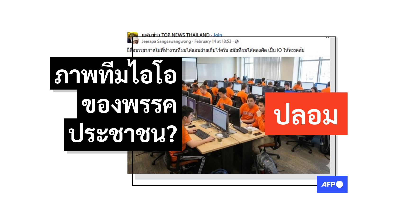 ภาพของห้องทำงานที่เต็มไปด้วยผู้คนสวมใส่เสื้อสีส้มขณะนั่งทำงานอยู่หน้าคอมพิวเตอร์ถูกแชร์ในโพสต์เฟซบุ๊กเมื่อวันที่ 14 กุมภาพันธ์ 2569
