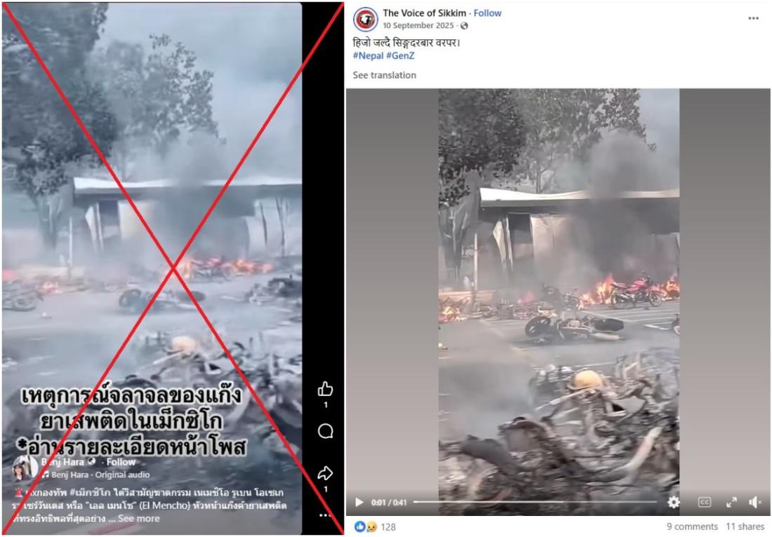 หลังหน่วยความมั่นคงเม็กซิโกสังหารเนเมซิโอ โอเซเกรา หรือ "เอล เมนโช" ผู้นำแก๊งค้ายาในรัฐฮาลิสโก เมื่อวันที่ 22 กุมภาพันธ์ 2569 ผู้ใช้งานสื่อสังคมออนไลน์จำนวนหนึ่งได้แชร์คลิปวิดีโอที่แสดงให้เห็นซากรถยนต์ที่ถูกไฟไหม้ โดยอ้างว่าเป็นภาพเหตุจลาจลจากการปะทะกันระหว่างเจ้าหน้าที่และสมาชิกแก๊งค้ายาในเม็กซิโก อย่างไรก็ตาม AFP ตรวจสอบคลิปดังกล่าวแล้วพบว่า คลิปนี้บันทึกเหตุการณ์ประท้วงต่อต้านคอร์รัปชันในประเทศเนปาลเมื่อเดือนกันยายน 2568
