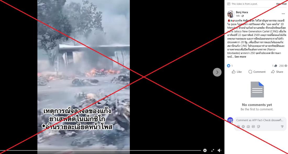 โพสต์เฟซบุ๊กเมื่อวันที่ 23 กุมภาพันธ์ 2569 แชร์คลิปวิดีโอฉบับหนึ่งที่ฝังข้อความไว้ว่า "เหตุการณ์จลาจลของแก๊งยาเสพติดในเม็กซิโก"