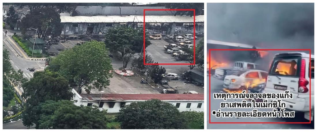 เมื่อ AFP เปรียบเทียบส่วนดังกล่าวของภาพกับวิดีโอที่ถูกแชร์อย่างแพร่หลาย ก็พบว่าลักษณะของรถที่ถูกไฟไหม้นั้นนั้นมีความสอดคล้องกัน
