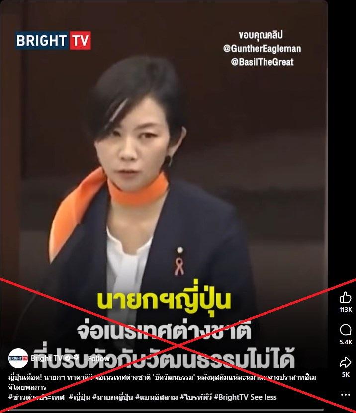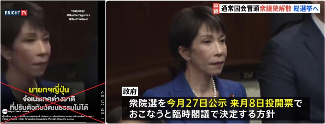 นายกรัฐมนตรีฝั่งอนุรักษนิยมของญี่ปุ่น ซานาเอะ ทาคาอิจิ ได้ให้คำมั่นว่าจะใช้มาตรการตรวจคนเข้าเมืองที่เข้มงวดยิ่งขึ้น แต่วิดีโอในโพสต์เท็จที่อ้างว่าเธอออกคำสั่งเนรเทศชาวต่างชาติ "ที่ปรับตัวกับวัฒนธรรมไม่ได้" ที่จริงแล้วเป็นการตัดต่อคลิปเก่าที่ไม่มีความเกี่ยวข้องกับประเด็นดังกล่าวเข้าด้วยกัน และไม่มีรายงานอย่างเป็นทางการที่ยืนยันได้ว่าญี่ปุ่นมีแผนประกาศใช้นโยบายตามที่โพสต์เท็จกล่าวอ้าง