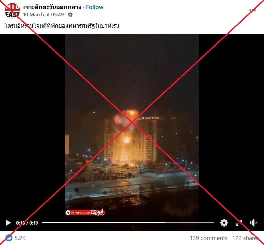 คลิปจากยูเครนถูกแชร์ว่าเป็นภาพโดรนของอิหร่านโจมตีโรงแรมในบาห์เรน