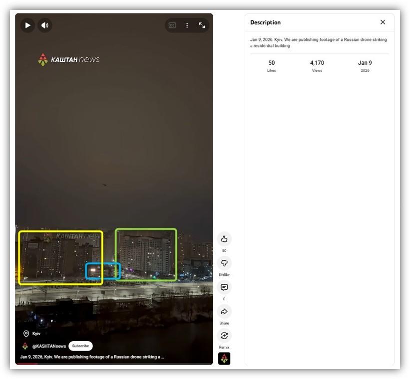 โดยคำบรรยายวิดีโอระบุว่า "9 ม.ค. 2569 ณ กรุงเคียฟ นี่คือคลิปเหตุการณ์โดรนรัสเซียโจมตีอาคารที่พักอาศัย" โดยมีลายน้ำของช่องยูทูบดังกล่าวปรากฏขึ้นตลอดทั้งวิดีโอ