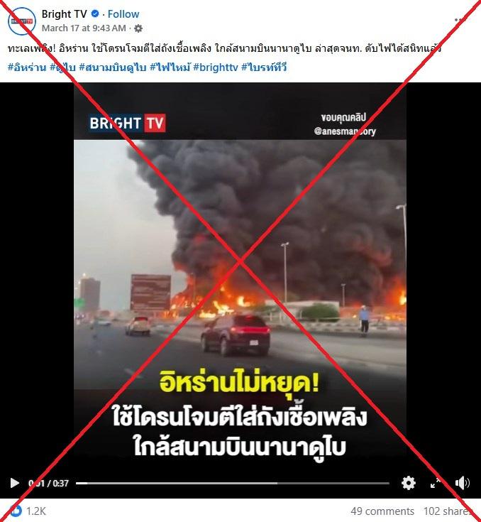 "ทะเลเพลิง! อิหร่าน ใช้โดรนโจมตีใส่ถังเชื้อเพลิง ใกล้สนามบินนานาดูไบ ล่าสุดจนท. ดับไฟได้สนิทแล้ว" คำบรรยายวิดีโอเฟซบุ๊กที่เผยแพร่เมื่อวันที่ 17 มีนาคม 2569 ระบุ