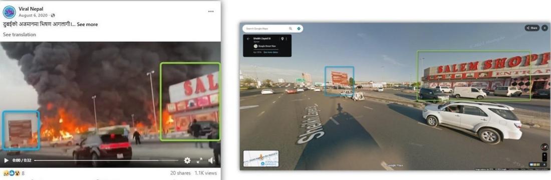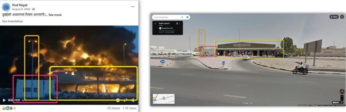 การค้นหาภาพย้อนหลังบนกูเกิลพบวิดีโอเดียวกันถูกเผยแพร่ในโพสต์เฟซบุ๊กตั้งแต่วันที่ 6 สิงหาคม ปี 2563 ซึ่งคำบรรยายโพสต์ภาษาเนปาลกล่าวว่านี่เป็นวิดีโอเหตุเพลิงไหม้รุนแรงในรัฐอัจญ์มานของยูเออี (ลิงก์บันทึก)
