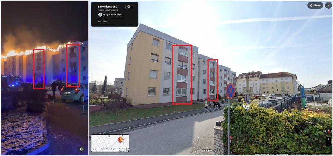 คำบรรยายโพสต์ระบุว่า คลิปดังกล่าวบันทึกเหตุไฟไหม้อาคารที่พักอาศัยในเมืองเทราน์ (Traun) ประเทศออสเตรีย ในช่วงการฉลองคืนส่งท้ายปีเก่า