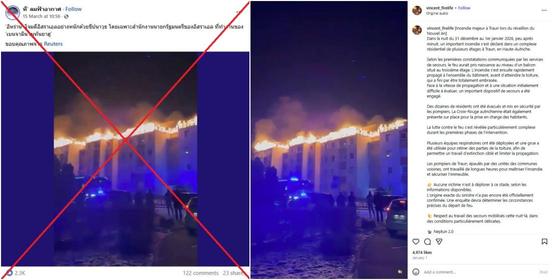 คลิปเหตุไฟไหม้ในออสเตรียถูกแชร์ว่าเป็นภาพสำนักงานของนายกฯ อิสราเอลถูกโดรนอิหร่านโจมตี