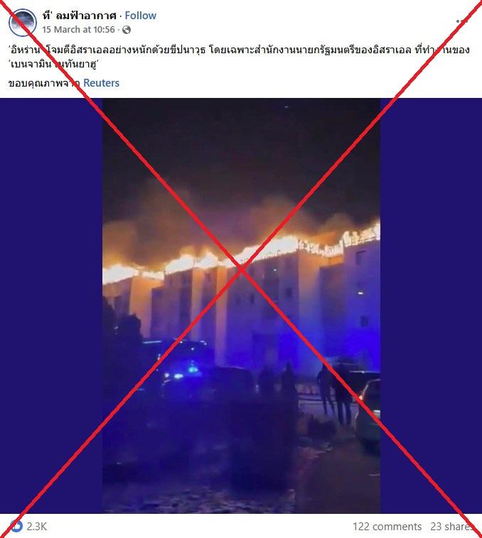 "'อิหร่าน' โจมตีอิสราเอลอย่างหนักด้วยขีปนาวุธ โดยเฉพาะสำนักงานนายกรัฐมนตรีของอิสราเอล ที่ทำงานของ 'เบนจามิน เนทันยาฮู'" โพสต์เฟซบุ๊กเมื่อวันที่ 15 มีนาคม 2569 ระบุ
