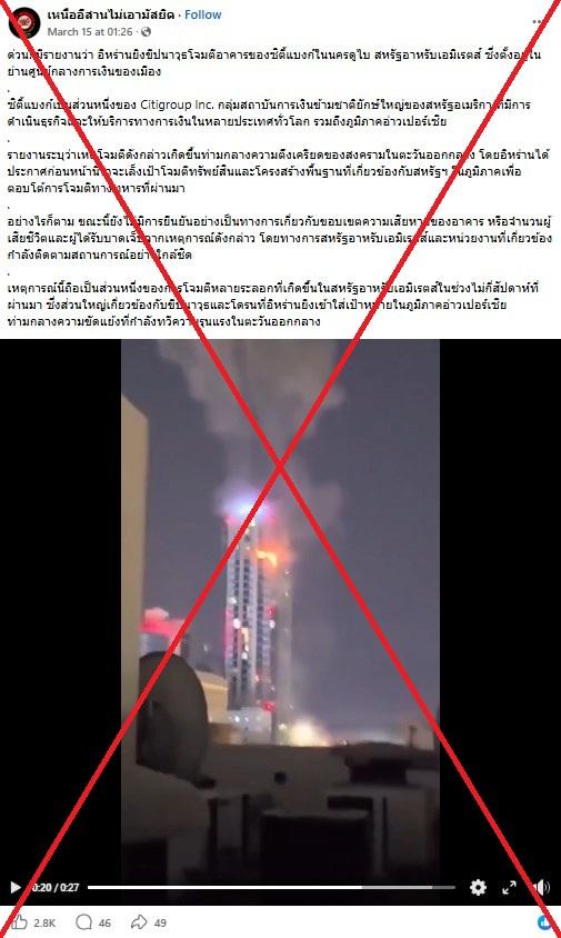 ภูมิภาคอ่าวอาหรับได้รับผลกระทบอย่างหนักหลังอิหร่านยิงตอบโต้ปฏิบัติการร่วมระหว่างสหรัฐฯ และอิสราเอลเมื่อวันที่ 28 กุมภาพันธ์ แต่วิดีโอที่เผยแพร่บนโลกออนไลน์ไม่ได้แสดงอาคารของธนาคารสัญชาติอเมริกันในดูไบตามคำกล่าวอ้างเท็จ แต่เป็นอาคารที่พักอาศัยในประเทศบาห์เรนที่ถูกอิหร่านโจมตี ด้านธนาคารซิตี้กรุ๊ปยืนยันว่ารายงานเกี่ยวกับความเสียหายของสำนักงานในตะวันออกกลางเป็นข่าวปลอม