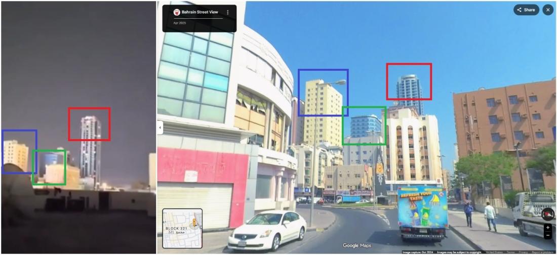 การค้นหาคำสำคัญต่อมาพบเว็บไซต์ทางการของเอราวิวทาวเวอร์ (Era View Tower) ในกรุงมานามา ประเทศบาห์เรน (ลิงก์บันทึก) ซึ่งมีลักษณะตรงกับอาคารที่ปรากฏในวิดีโอและสอดคล้องกับภาพจากแผนที่กูเกิลสตรีตวิวของกรุงมานามาเช่นกัน (ลิงก์บันทึก)