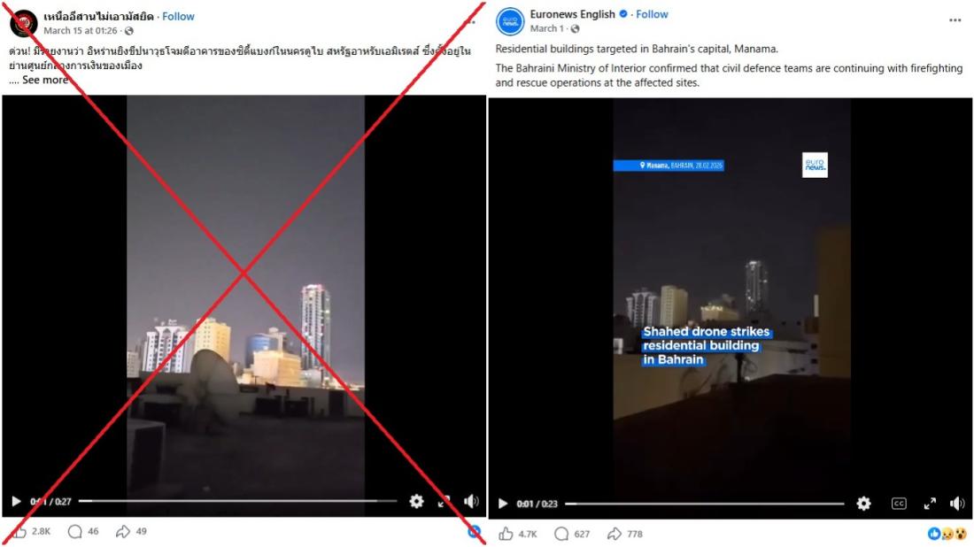 การค้นหาภาพย้อนหลังบนกูเกิลโดยใช้เฟรมสำคัญจากวิดีโอในโพสต์เท็จ พบคลิปเดียวกันที่มีความละเอียดสูงกว่าถูกแชร์อยู่ในคลิปรวมเหตุการณ์ในโพสต์เฟซบุ๊กของเพจช่องข่าว Euronews ที่ได้รับการยืนยันเมื่อวันที่ 1 มีนาคม 2569 (ลิงก์บันทึก)