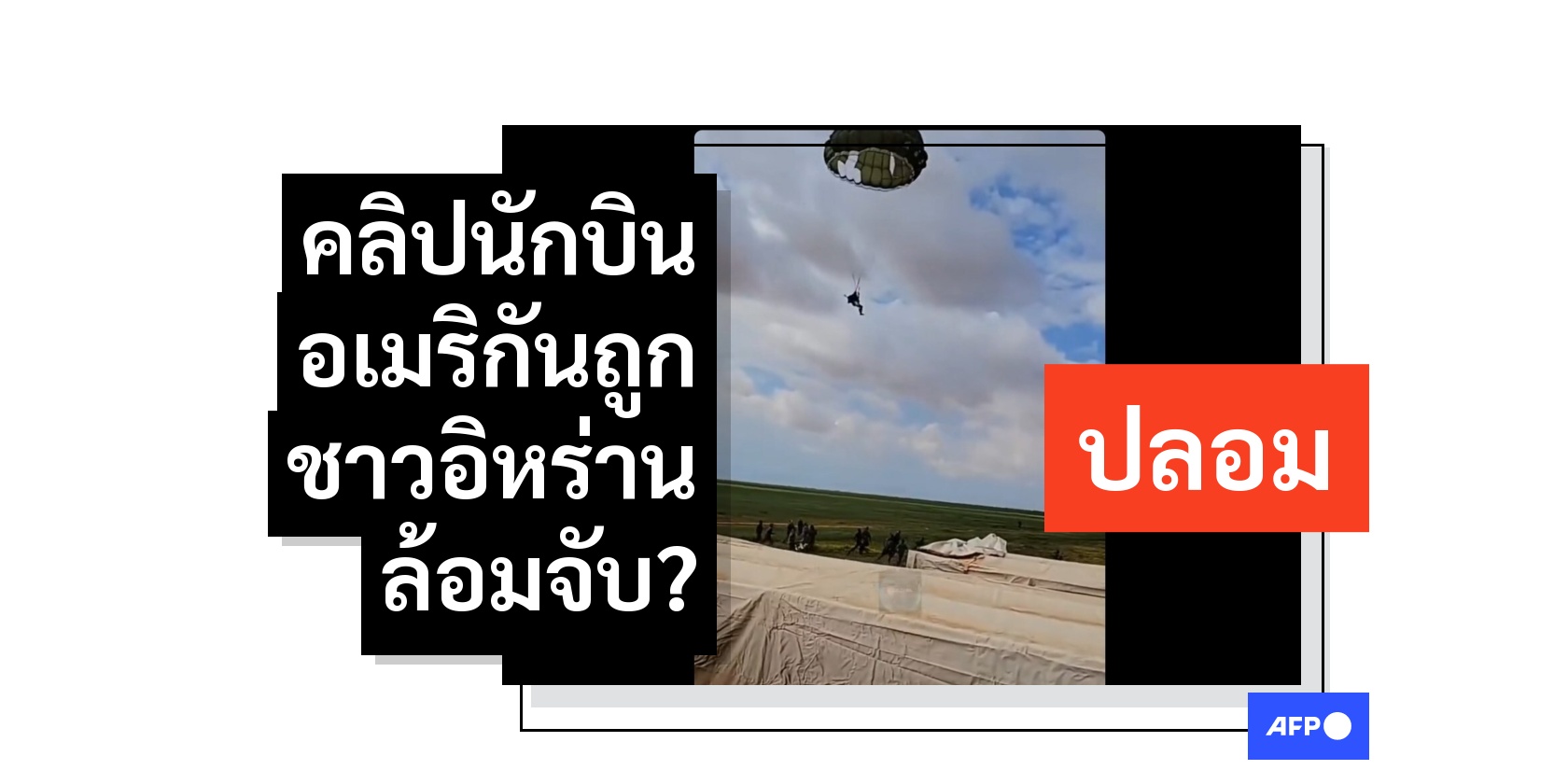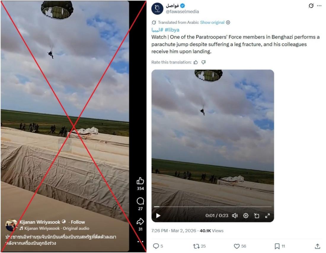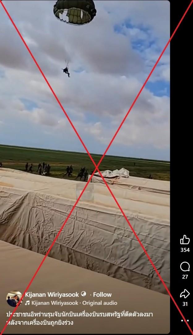 หลังอิหร่านอ้างว่าสามารถยิงเครื่องบินรบของสหรัฐฯ ตกในช่วงต้นเดือนเมษาน 2569 ผู้ใช้สื่อสังคมออนไลน์จำนวนหนึ่งได้แชร์คลิปวิดีโอเก่าที่แสดงภาพนักกระโดดร่ม โดยอ้างว่าแสดงเหตุการณ์ที่นักบินสหรัฐฯ ดีดตัวออกจากเครื่องบินรบที่ถูกยิงตก อย่างไรก็ตาม การตรวจสอบของ AFP พบว่า ที่จริงแล้ว คลิปดังกล่าวบันทึกการฝึกทหารกระโดดร่มในประเทศลิเบีย และไม่มีความเกี่ยวข้องกับสงครามในภูมิภาคตะวันออกกลางแต่อย่างใด