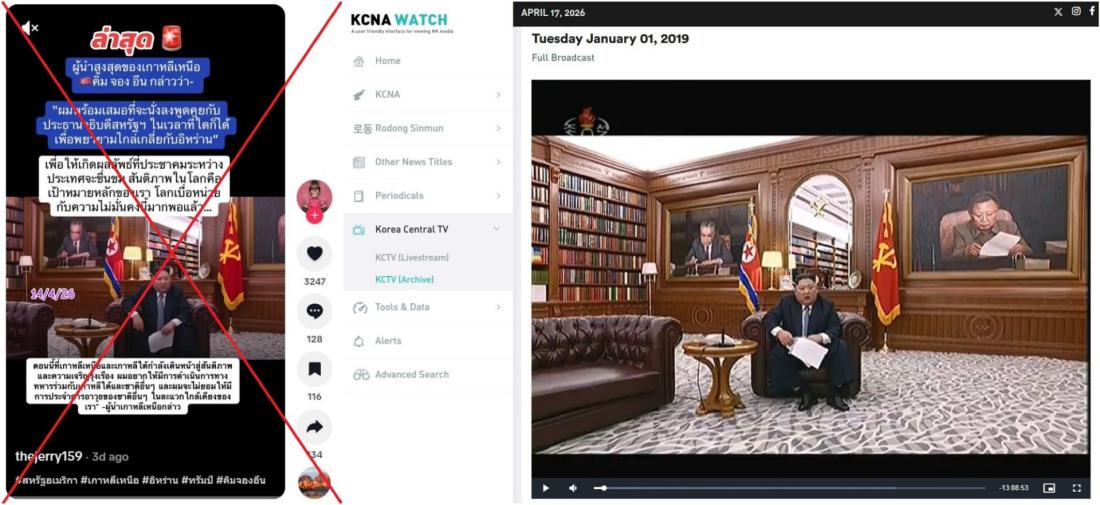 จากการค้นหาด้วยคำสำคัญในคลังข้อมูลของ KCNA Watch ซึ่งเป็นเว็บไซต์ติดตามสื่อเกาหลีเหนือ พบว่าคลิปที่ถูกนำมาแชร์พร้อมคำกล่าวอ้างเท็จนั้นเป็นส่วนหนึ่งของสุนทรพจน์ที่ออกอากาศทางสถานีโทรทัศน์แห่งชาติเกาหลีเหนือเมื่อวันที่ 1 มกราคม 2562 (ลิงก์บันทึก)