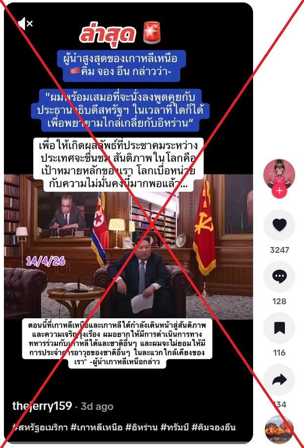 โพสต์ติ๊กตอกเมื่อวันที่ 13 เมษายน 2569 แชร์คลิปฉบับหนึ่งที่ฝังข้อความว่า "ล่าสุด ผู้นำสูงสุดของเกาหลีเหนือ คิม จอง อึน กล่าวว่า- 'ผมพร้อมเสมอที่จะนั่งลงพูดคุยกับประธานาธิบดีสหรัฐฯ ในเวลาที่ใดก็ได้เพื่อพยายามไกล่เกลี่ยกับอิหร่าน'"