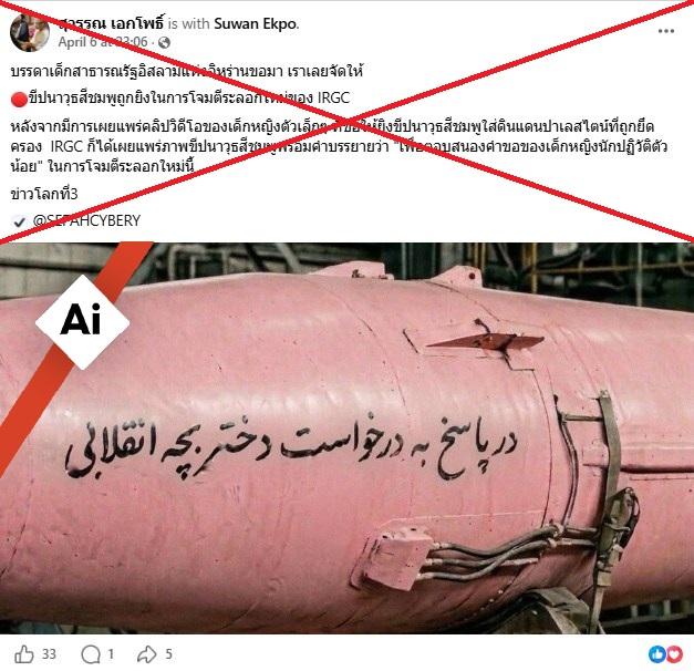 ข้อตกลงหยุดยิงระยะเวลาสองสัปดาห์ในตะวันออกกลางยังคงมีผลบังคับใช้ขณะที่สหรัฐฯ ดำเนินมาตรการปิดล้อมในช่องแคบฮอร์มุซ โดยก่อนที่จะมีการประกาศหยุดยิงชั่วคราว ผู้ใช้งานสื่อสังคมออนไลน์ได้เผยแพร่ภาพขีปนาวุธสีชมพูและอ้างว่ากองกำลังอิหร่านสร้างอาวุธนี้ขึ้นตามคำขอของเด็กหญิงคนหนึ่งที่ต้องการให้ยิงโจมตีอิสราเอล อย่างไรก็ตาม ผลการตรวจสอบจากเครื่องมือต่าง ๆ ยืนยันตรงกันว่าภาพนี้ถูกสร้างขึ้นด้วยเอไอ