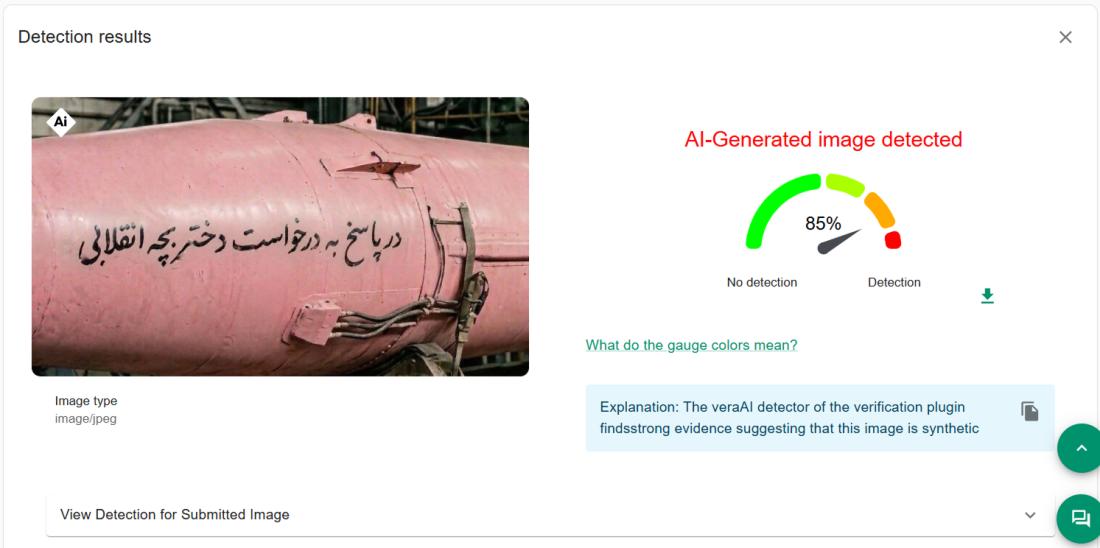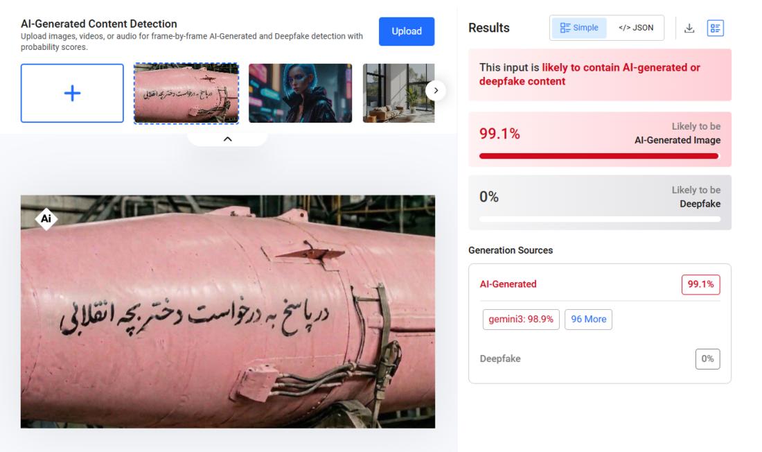 "โดยเฉพาะสายไฟที่ไม่เหมือนกับตัวเชื่อมต่อที่พบได้ในขีปนาวุธพิสัยไกลที่มีอยู่จริง ไม่ว่าจะของอิหร่านหรือประเทศอื่น และดูเหมือนว่าสายไฟดังกล่าวไม่ได้ถูกเดินสายอย่างสมเหตุสมผล ซึ่งเป็นลักษณะที่พบได้บ่อยในภาพที่สร้างด้วยเอไอ"