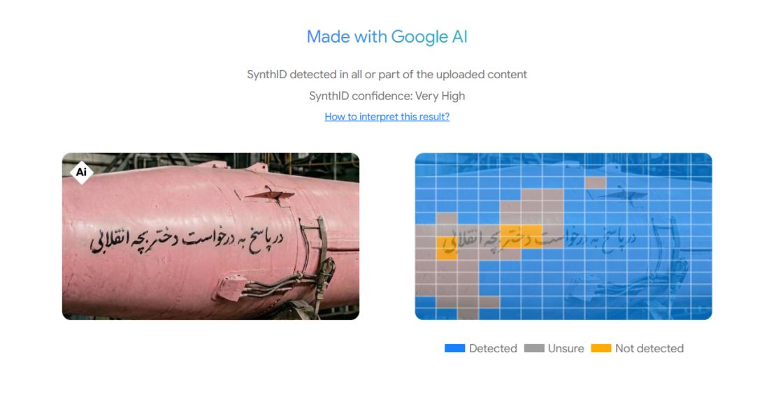 เครื่องมือตรวจจับซินธ์ไอดีตรวจพบลายน้ำเฉพาะที่ยืนยันได้ว่าภาพนี้ถูกสร้างขึ้นด้วยเครื่องมือเอไอของกูเกิลเอง (ลิงก์บันทึก)