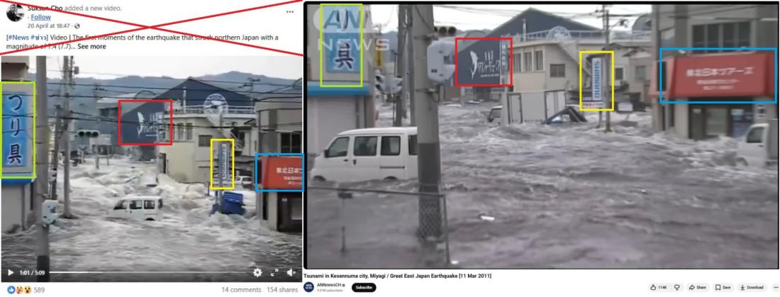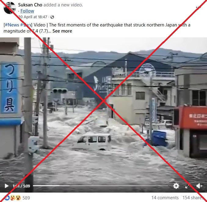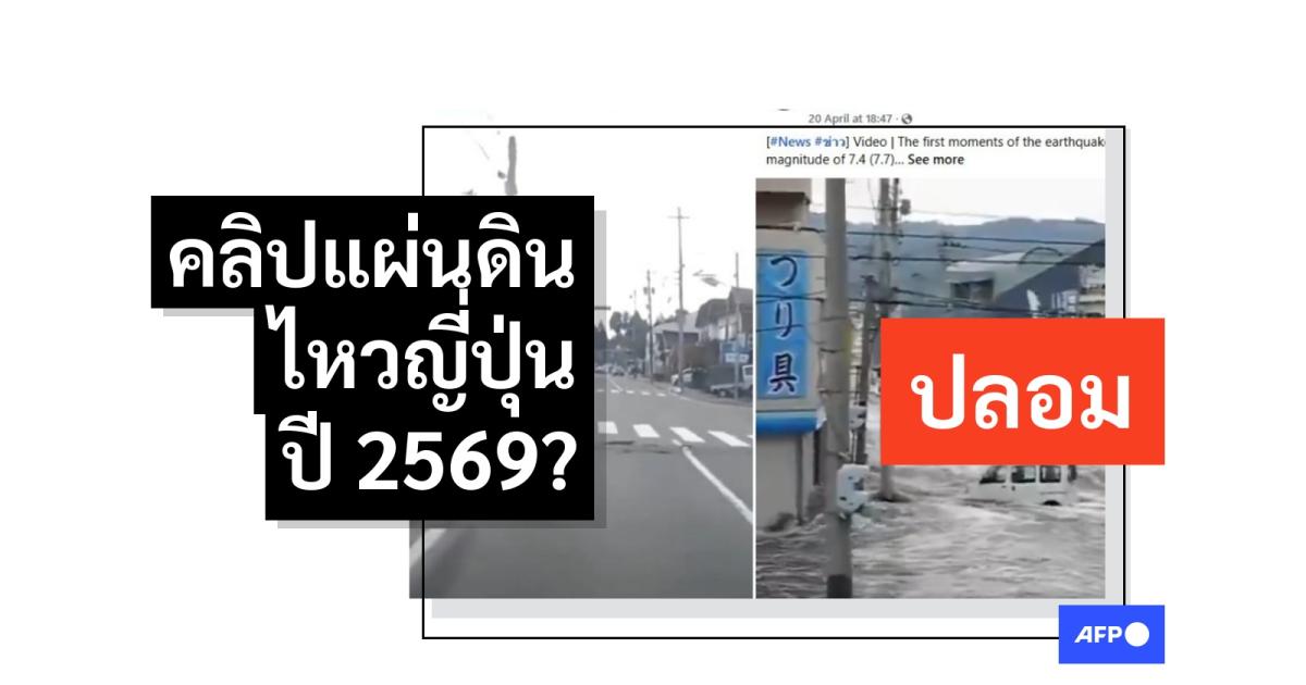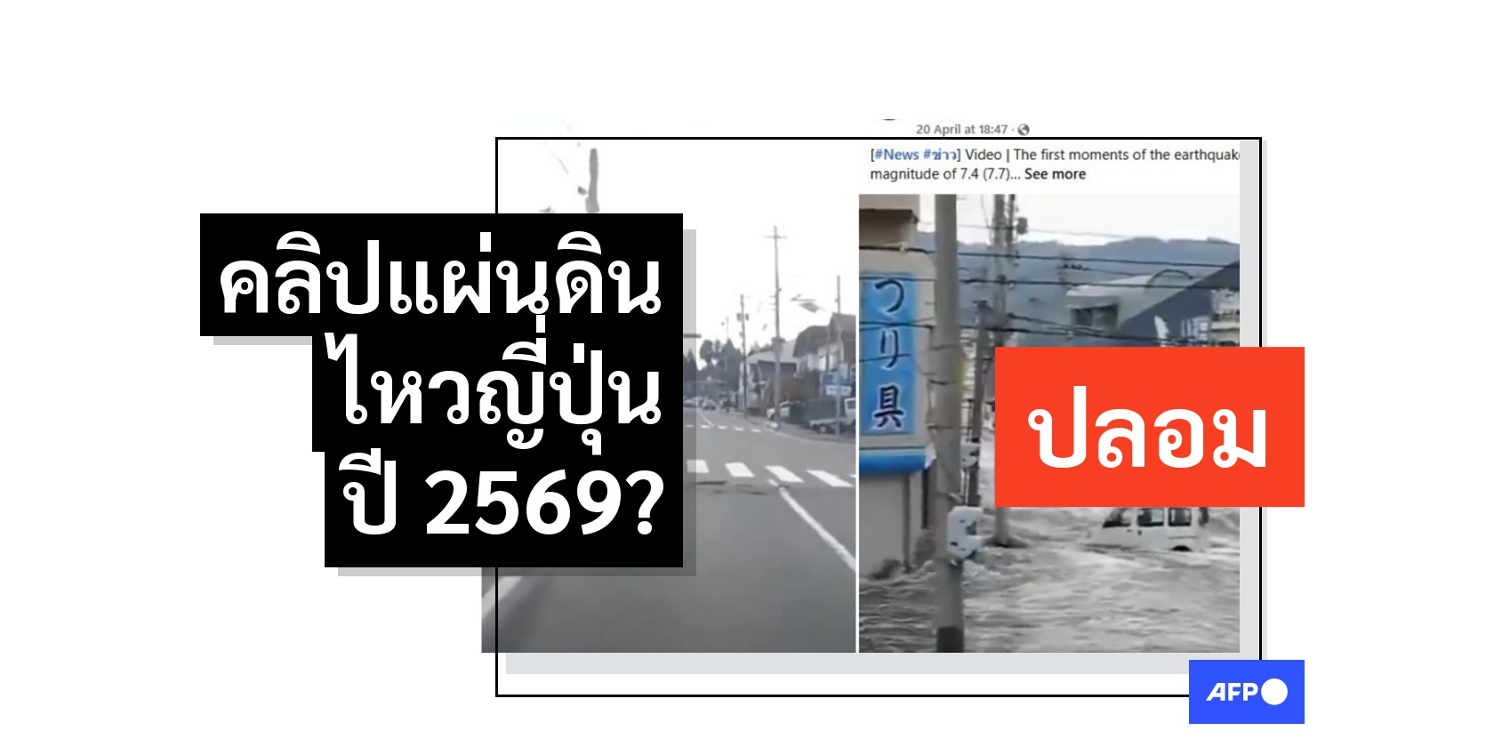 หลังเกิดเหตุแผ่นดินไหวขนาด 7.7 บริเวณนอกชายฝั่งตะวันออกเฉียงเหนือของญี่ปุ่นเมื่อวันที่ 20 เมษายน 2569 ผู้ใช้สื่อสังคมออนไลน์จำนวนหนึ่งได้แชร์คลิปวิดีโอโดยอ้างว่าเป็นภาพจากเหตุแผ่นดินไหวดังกล่าว อย่างไรก็ตาม คลิปเหล่านี้แสดงภาพภัยพิบัติในอดีตที่ถูกนำมาแชร์อย่างผิด ๆ โดยคลิปแรกนั้นเผยให้เห็นภาพความเสียหายหลังจากเหตุแผ่นดินไหวที่จังหวัดหนึ่งในภาคตะวันตกของญี่ปุ่นเมื่อวันขึ้นปีใหม่ปี 2567 ส่วนอีกคลิปเป็นภาพเหตุการณ์แผ่นดินไหวและสึนามิครั้งใหญ่เมื่อเดือนมีนาคม 2554