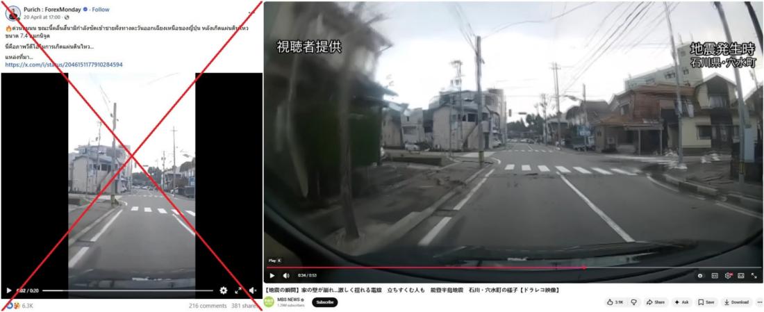 และเมื่อ AFP ค้นหาด้วยคำสำคัญบนกูเกิลเพิ่ม พบว่าวิดีโอเดียวกันนี้เคยถูกเผยแพร่มาก่อนในโพสต์ X เมื่อวันที่ 6 มกราคม 2567 โดยผู้ใช้งานที่เผยแพร่คลิปนี้ได้บอกเล่าประสบการณ์การอพยพพร้อมกับครอบครัวในช่วงที่เกิดแผ่นดินไหว (ลิงก์บันทึก)