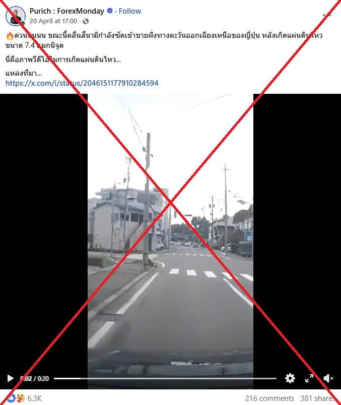"ด่วนนนนน ขณะนี้คลื่นสึนามิกำลังซัดเข้าชายฝั่งทางตะวันออกเฉียงเหนือของญี่ปุ่น หลังเกิดแผ่นดินไหวขนาด 7.4 แมกนิจูด นี่คือภาพวีดีโอในการเกิดแผ่นดินไหว..." โพสต์เฟซบุ๊กเมื่อวันที่ 20 เมษายน 2569 เขียนคำบรรยาย